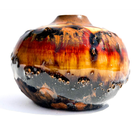 Mae ei chyfres ddiweddaraf yn astudiaeth o natur anrhagweladwy dan reolaeth, sy’n cyfuno cemeg gwydredd â dynameg ddigymell yr odyn i gynhyrchu arwynebau organig sy’n esblygu. Caiff pob llestr maint llaw ei daflu a’i drimio’n ofalus, a’i ddefnyddio fel cynfas i’r gwydredd ymateb a thrawsnewid, sy’n gwahodd cysylltiad tawel, cyffyrddol rhwng y gwrthrych, y gwyliwr a’r amgylchedd naturiol.